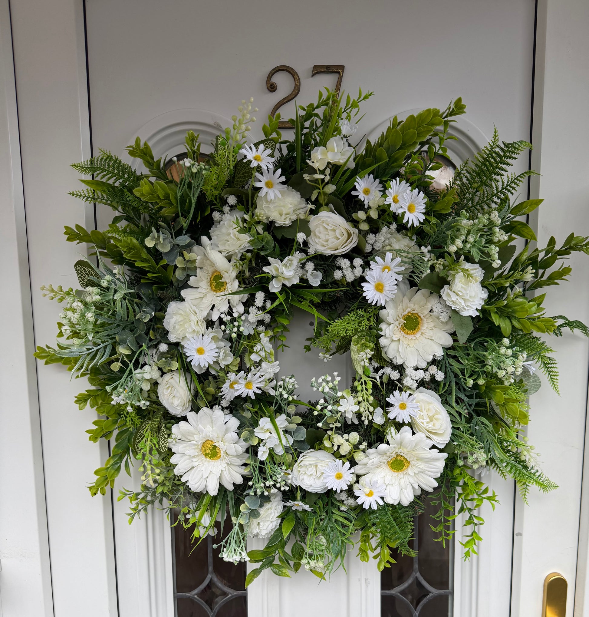 Featuring realistic faux daisies, roses, and delicate filler florals on a full greenery base — perfect for brightening your front door all season long.